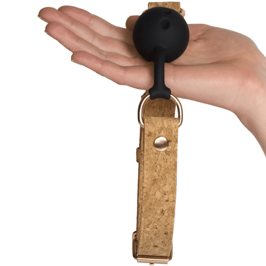 Bâillon noir rond en silicone (Ø 4 cm) de Vegan Fetish sur des lanières en liège naturel avec la belle optique typique, les éléments métalliques sont dans un brillant doré. La courroie en liège avec fermeture à boucle est réglable en circonférence de 45 cm à 60 cm.
