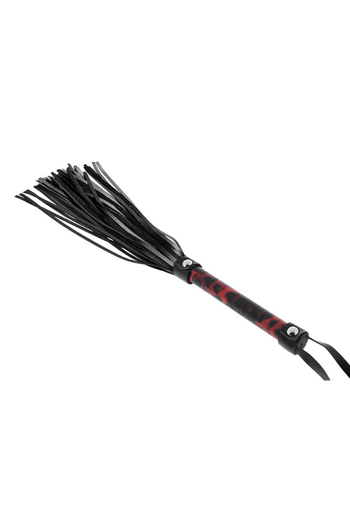 Martinet avec des cordes en simili cuir de 24 cm de long. Poignée facile à saisir en matériau d’aspect cuir avec un design brodé noir et rouge élégant. Le fouet est doté d’un cordon de poignet pratique.