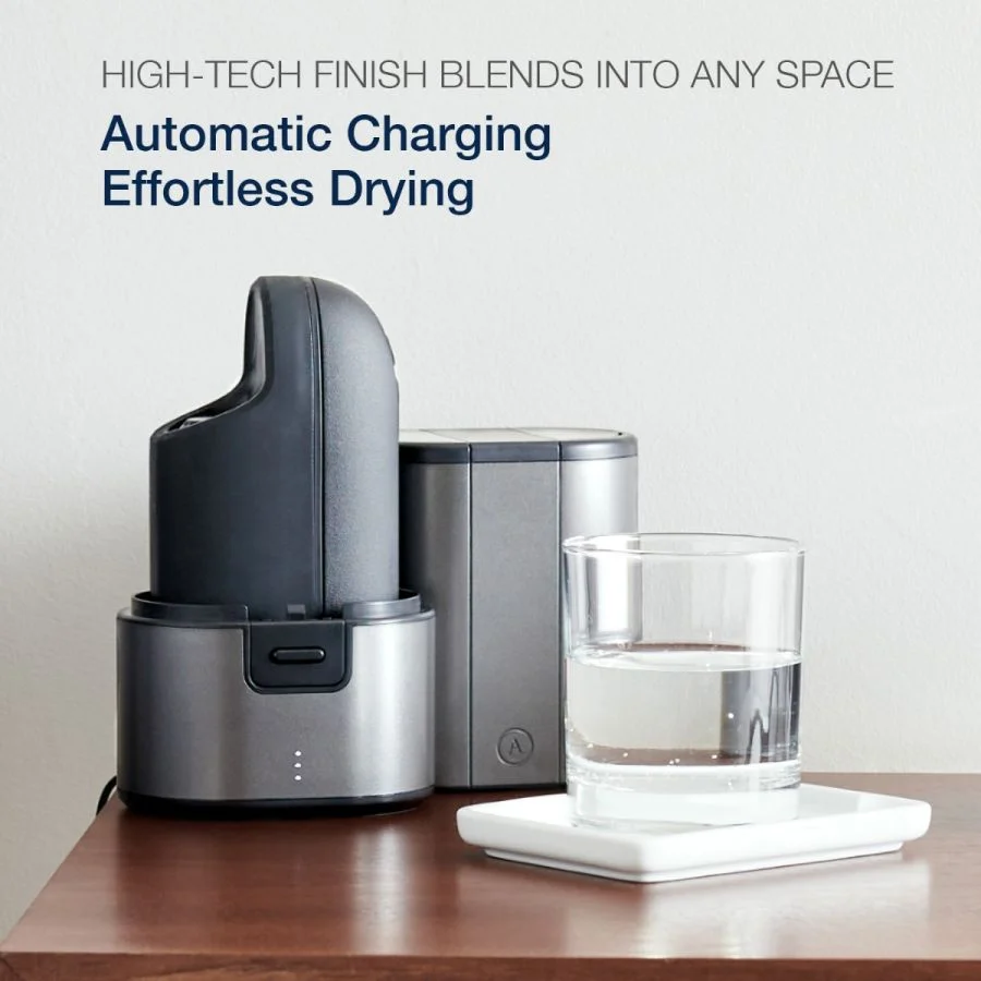 Le nettoyage et le séchage n’ont plus à être des corvées. Il suffit de tourner le dispositif, de rincer l’Ion avec de l’eau et de le remettre dans son socle de rangement discret pour une recharge et un séchage sans effort.