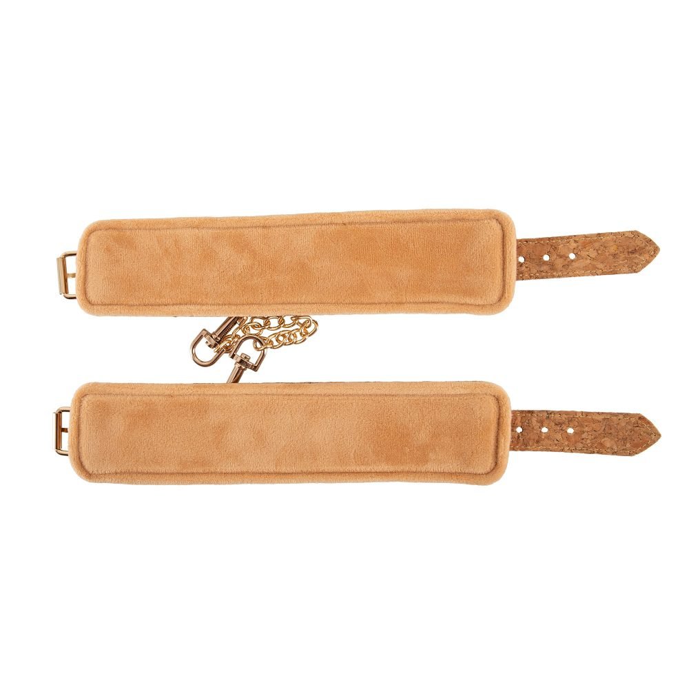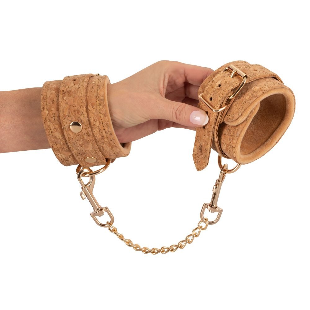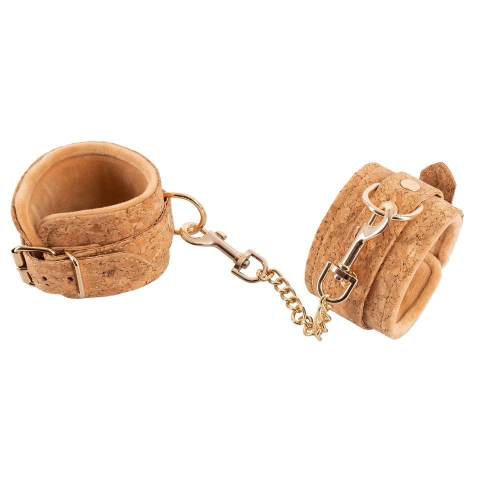 Menottes stables et de haute qualité de Vegan Fetish en liège naturel avec une belle optique typique. La chaîne de connexion et les éléments métalliques sont de couleur dorée brillante. Les manchettes sont doublées à l’intérieur d’une légère peluche de couleur assortie pour un meilleur confort et ont chacune un anneau pour accrocher la chaîne de connexion à mousqueton fournie.