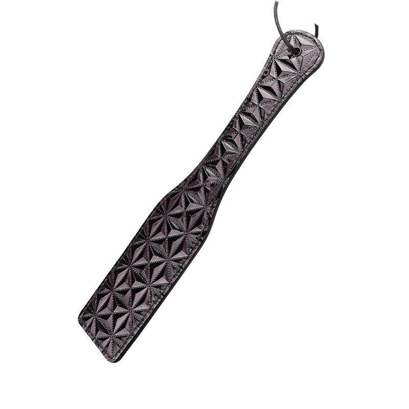 Cette pagaie pour le jeu BDSM est faite d’un matériau d’aspect cuir avec un design élégant et brillant en relief noir et violet sur la face avant et a une face arrière lisse. Les différentes textures provoqueront des sensations différentes. Il dispose d’une dragonne pratique. La pagaie est légèrement flexible pour une fessée douce ou ferme, à utiliser avec précaution.